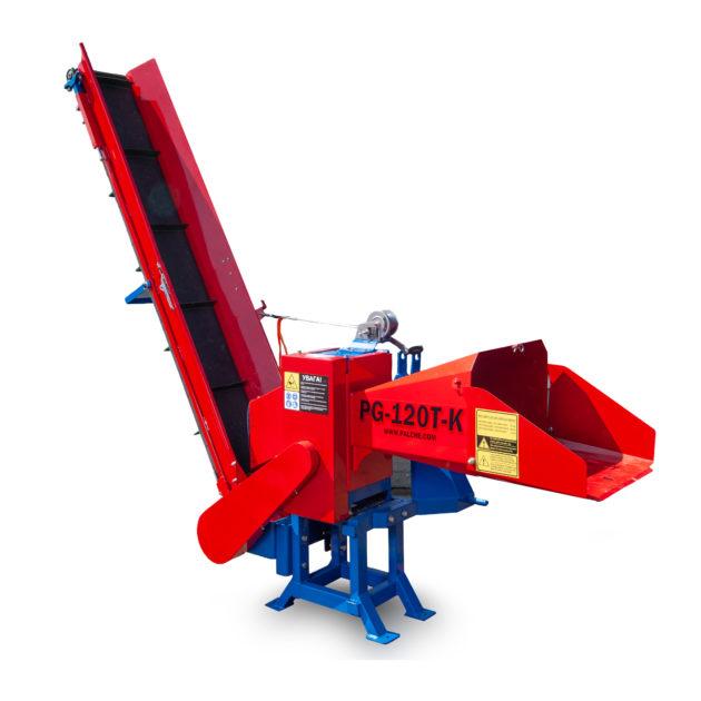 Подрібнювач гілок серії Т приводитися в дію від ВВП трактора і навішується на стандартну трьох точкову навіску. Мінімальна необхідна потужність для роботи із подрібнювачем гілок становить 25 к. с. Подрібнювач гілок моделі PG-120Т К здатний перерубати гілки базі якої породи діаметром до 12 см, а також гілки твердої породи діаметром до 10 см., (плоского матеріалу) ламелей та рейок до 6 см. Продуктивність подрібнювача гілок PG-120Т-К складає 10 м3 готової продукції за годину роботи. Для з'єднання єднання трактора з подрібнювачем ми рекомендуємо використовувати карданний вал із фрикційною муфтою, яка захищає подрібнювач гілок і трактор від перевантаження. На подрібнювачі серії К встановлена транспортувальна стрічка, за допомогою якої подрібнена сировина може подаватись на причіп вантажного автомобіля, трактора, або в спеціальний контейнер, це дозволяє скоротити час та кількість персоналу, та збільшити продуктивність. Подібне розміщення транспортера буде дуже зручним для комунальних господарств і дорожніх служб. Висота підйому транспортувальної стрічки легко регулюється лебідкою. Подрібнювачі гілок можуть використовуватися лісовими господарствами, комунальними службами, фермерськими господарствами, сільськими, міськими радами і.т.д. Повний цикл виробництва подрібнювача гілок відбувається на нашому підприємстві. Агрегати серії PG оснащені циліндричною системою різання і трьома типами приводів. Конфігурації з шести ножів приділяється особлива увага при розробці конструкцій подрібнювачів, так як вони є основним робочим елементом подрібнювачів і на них приходити ударне навантаження. До того ж сталеві ножі термічно оброблюють задля надання їм міцності, а для безпечної експлуатації вони закриті елементами подрібнювача. Механізм гілкоподрібнювачів автоматично втягує матеріал, який потрібно різати. Ми проводимо контроль якості на всіх етапах нашого виробництва. Обов'язково шліфуються всі посадочні поверхні. Постійно контролюється якість зварних швів. Корпуси механізмів виконані з сертифікованого листа товщиною 20 мм, Перед тим, як провести фарбування, ми робимо зачистку всіх конструкцій. Покриваються подрібнювачі порошковою фарбою, що надзвичайно подовжує термін служби конструкцій. Надійний корпус забезпечує довговічність та стабільність пристроїв. Слід зауважити, що показник продуктивності залежить від діаметру, породи, вологості, якості сировини та кількості персоналу залученого до роботи.